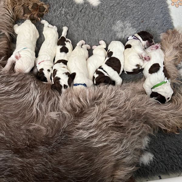 8 beautiful puppies arrived safely on October 12, 2024. Poppy and crew are doing great and the puppies are growing quickly! 6 boys, 2 girl, brown roan and orange roan.